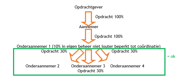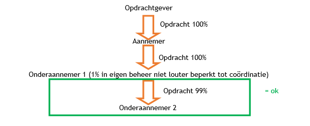 Volgens de parlementaire voorbereiding volstaat het zelfs dat de onderaannemer slechts 1% van de totale opdracht zelf realiseert en de overige 99% in onderaanneming geeft. Het is dus voldoende om als onderaannemer 1% van de opdracht zelf uit te voeren en de overige 99% van de opdracht over te maken aan zijn sub-onderaannemer op voorwaarde dat deze 1% geen coördinatie betreft